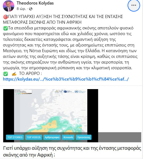 Σύμφωνα με τον μετεωρολόγο Θοδωρής Κολυδάς, τα επεισόδια μεταφοράς αφρικανικής σκόνης αποτελούν ένα φυσικό φαινόμενο. Ωστόσο, τα τελευταία χρόνια εμφανίζονται συχνότερα και με μεγαλύτερη ένταση.