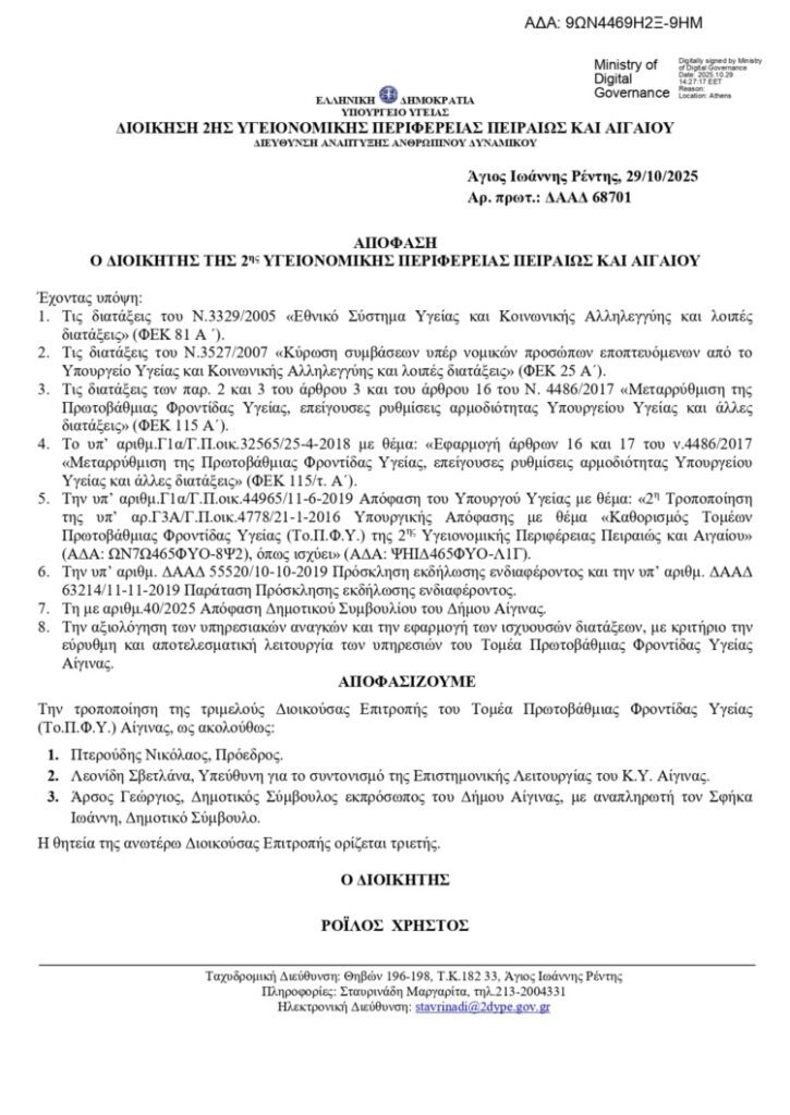 Η νέα Διοικούσα Επιτροπή του Τομέα Πρωτοβάθμιας Φροντίδας Υγείας Αίγινας έχει πλέον ως εξής: