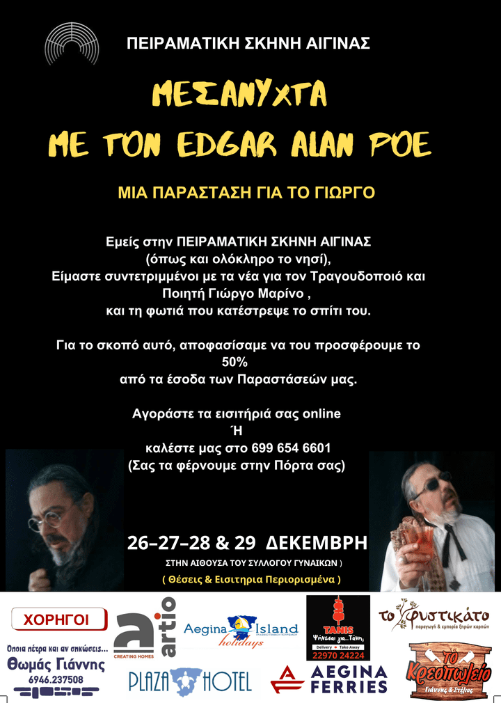 Στο πλαίσιο της παράστασης «Edgar Allan Poe», που θα πραγματοποιηθεί κατά την περίοδο Χριστουγέννων και Πρωτοχρονιάς, η σκηνή αποφάσισε να διαθέσει το μισό των εσόδων από τα εισιτήρια για να βοηθήσει τον Γιώργο να ξαναχτίσει τη ζωή του.